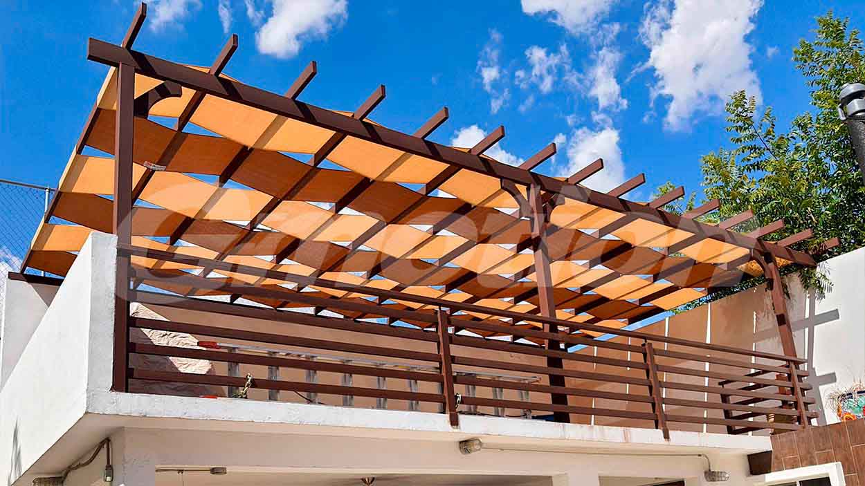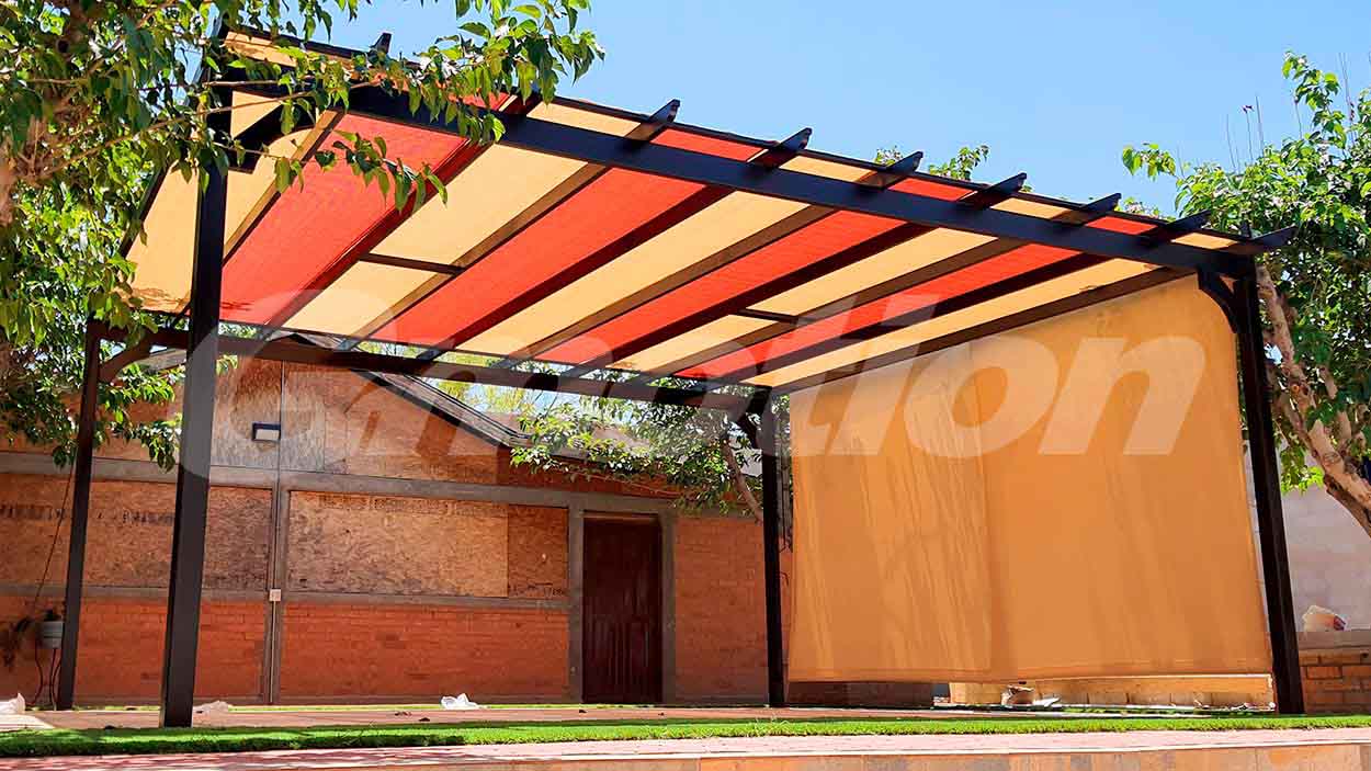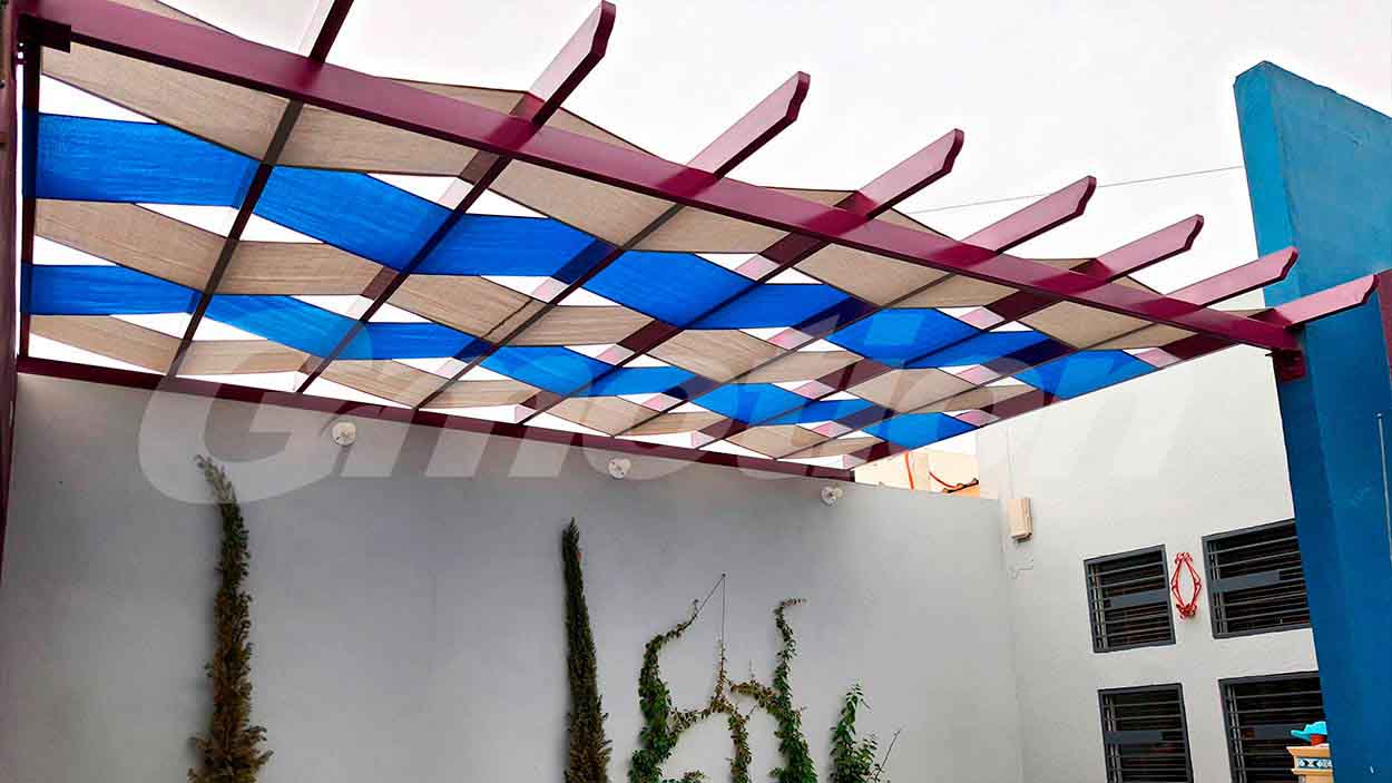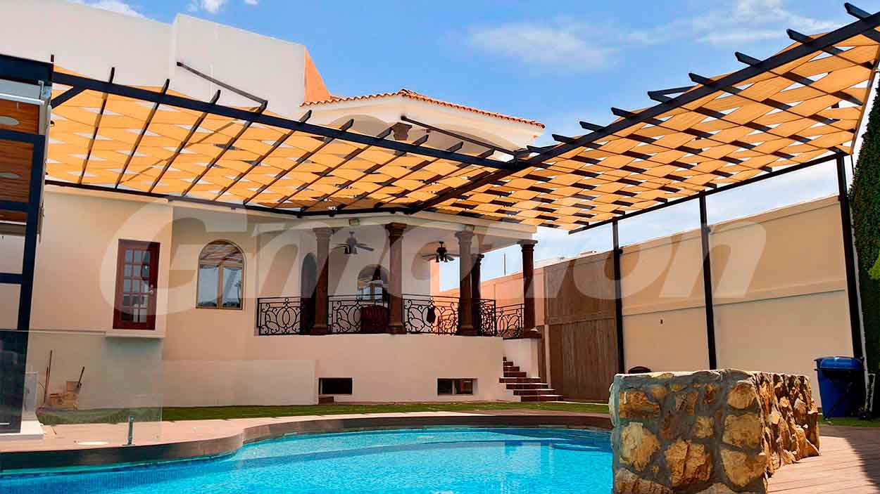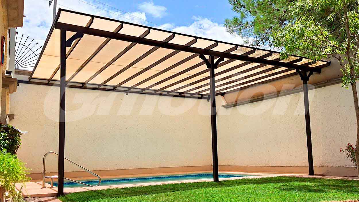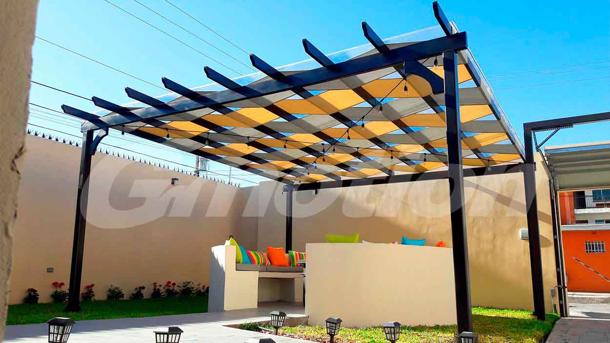 Las pérgolas son un elemento arquitectónico que convierte tu paisaje en un espacio de ensueño. En Gmotion sabemos conjugar muy bien los elementos de fierro y acero aplicados a las columnas, durmientes, cartabones y cabios, que son la base estructural de las pérgolas. Nos distinguen los finos detalles de herrería, contamos con 4 diferentes acabados para las puntas de los cabios. Personaliza tu pérgola seleccionando entre la variedad de colores en telas de polietileno de nuestro extenso catálogo con más de 30 opciones. O si lo deseas, el policarbonato celular es ideal para hacer tu espacio impermeable, o crear sombra cuando es en color blanco. Agregando una correcta iluminación genera ambientes únicos de noche, y nuestras bases para abanicos hacen la diferencia para mantener tu espacio fresco y confortable.. Columnas: Pilares que soportan las vigas longitudinales llamados durmientes. Durmientes: Travesaños que soportan el apergolado conformado por cabios. Cabios: Vigas transversales apoyadas en los durmientes con 4 puntas a escoger. Cartabones: Estructuras anguladas entre las columnas y los durmientes.