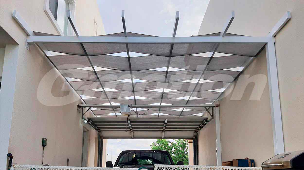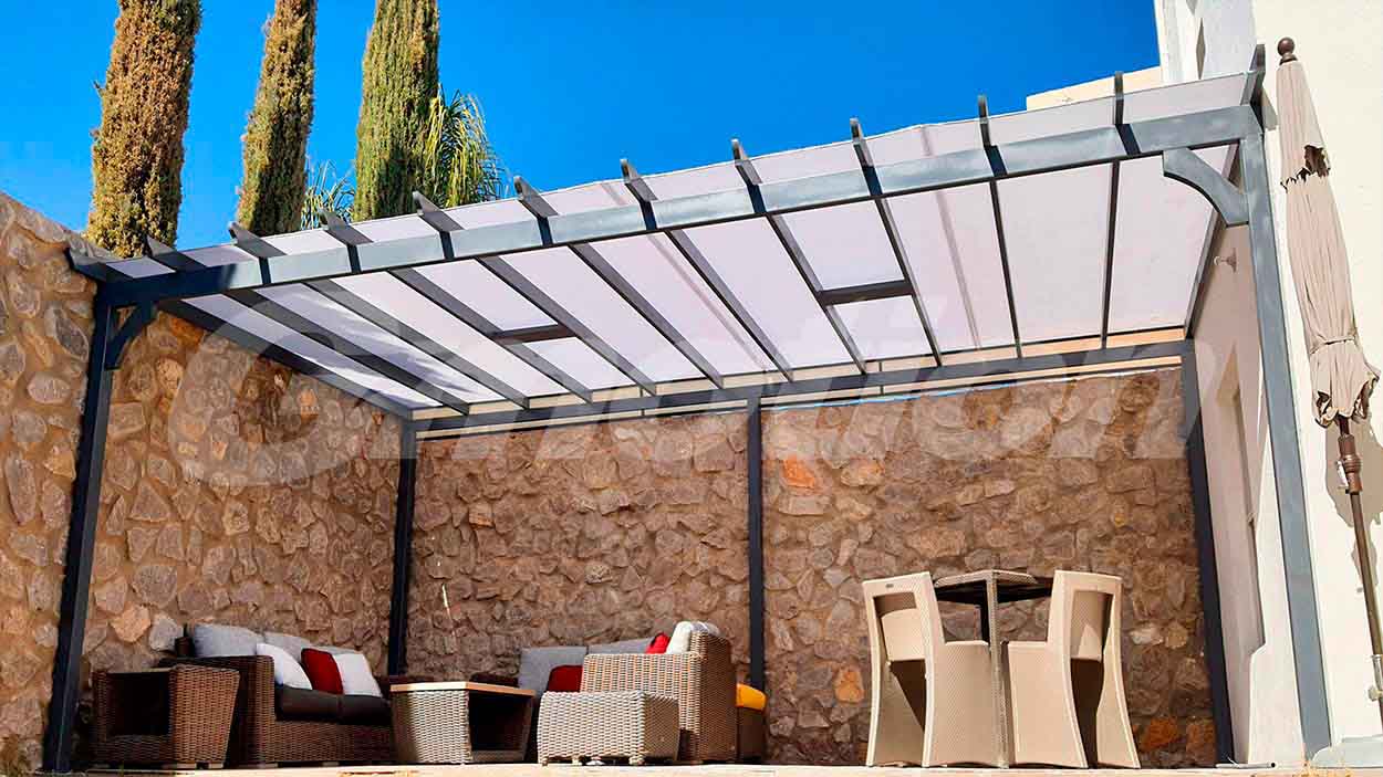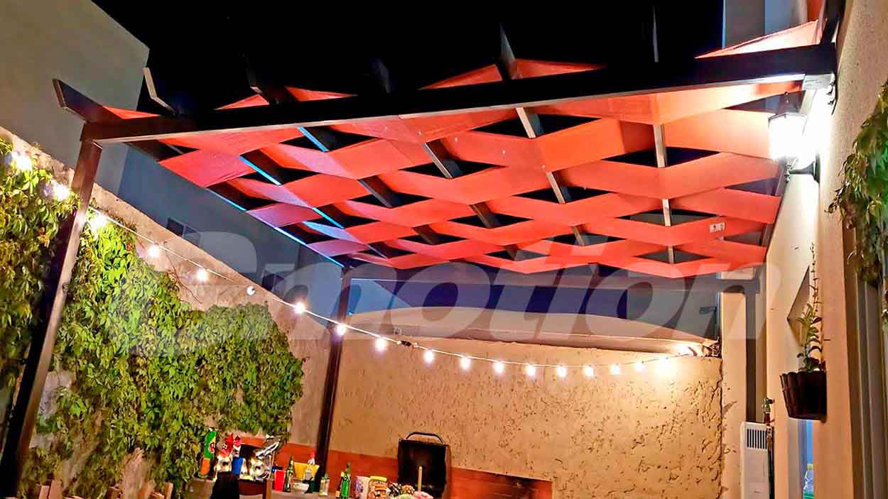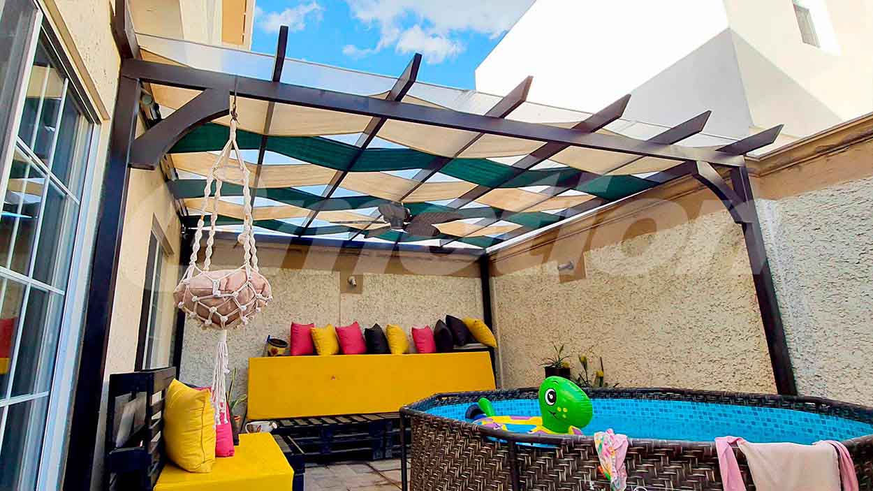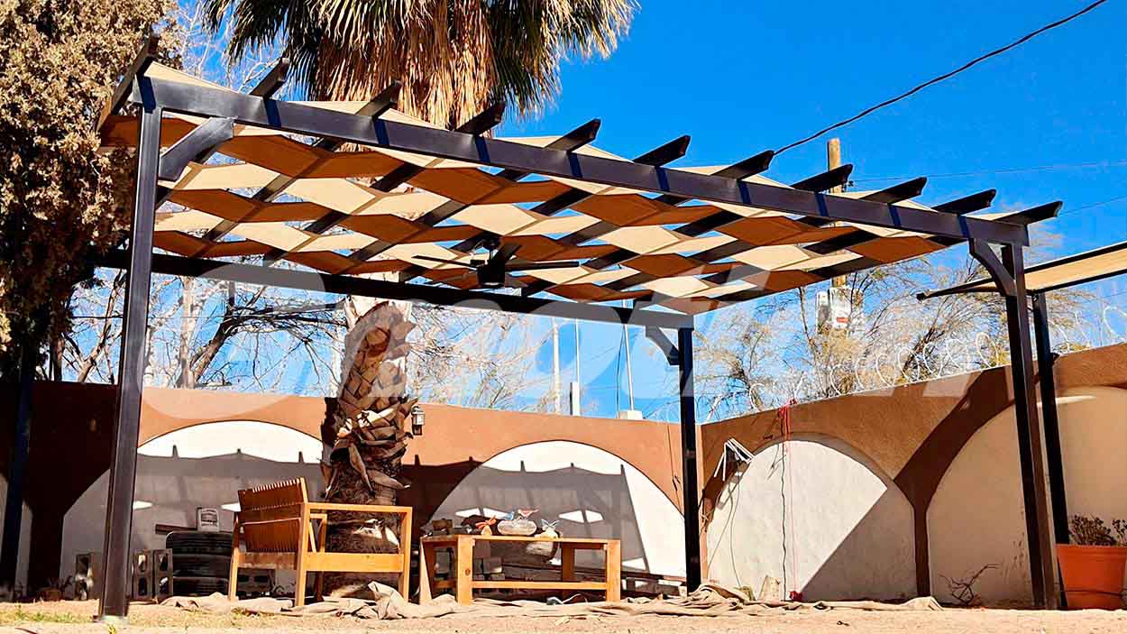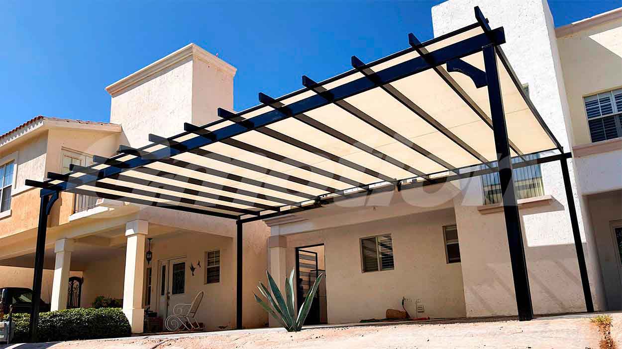 Las pérgolas son un elemento arquitectónico que convierte tu paisaje en un espacio de ensueño. En Gmotion sabemos conjugar muy bien los elementos de fierro y acero aplicados a las columnas, durmientes, cartabones y cabios, que son la base estructural de las pérgolas. Nos distinguen los finos detalles de herrería, contamos con 4 diferentes acabados para las puntas de los cabios. Personaliza tu pérgola seleccionando entre la variedad de colores en telas de polietileno de nuestro extenso catálogo con más de 30 opciones. O si lo deseas, el policarbonato celular es ideal para hacer tu espacio impermeable, o crear sombra cuando es en color blanco. Agregando una correcta iluminación genera ambientes únicos de noche, y nuestras bases para abanicos hacen la diferencia para mantener tu espacio fresco y confortable.. Columnas: Pilares que soportan las vigas longitudinales llamados durmientes. Durmientes: Travesaños que soportan el apergolado conformado por cabios. Cabios: Vigas transversales apoyadas en los durmientes con 4 puntas a escoger. Cartabones: Estructuras anguladas entre las columnas y los durmientes.